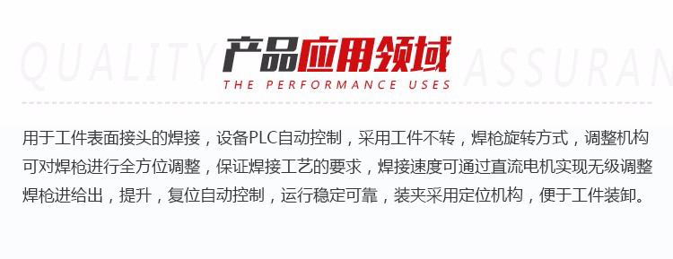 转枪焊机用于工件表面接头的焊接,设备PLC自动控制,采用工件不转,焊枪旋转方式,调整机构可对焊枪进行全方位调整,保证焊接工艺的要求,焊接速度可通过直流电机实现无级调整,焊枪进给出,提升,复位自动控制,运行稳定可靠,装夹采用定位机构,便于工件装卸。